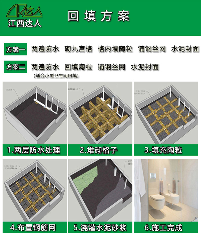 4. 箱回填約4/5時,用水泥沙漿找平約30mm-60mm,要壓實.如放置浴缸處必須加φ6鋼筋做成20cm方格狀.