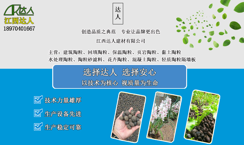 江西達人建材有限公司所生產(chǎn)的陶粒輕質(zhì)性更佳,具有密度小、強度高、吸水率大、保溫、隔熱、耐火、抗震等特點,用途十分廣泛,在取代普通砂石配制輕集料混凝土,用作水處理濾料、吸附劑、透水路面材料甚至于農(nóng)業(yè)、園林中無土培養(yǎng)基、橋面板??招钠鰤K等建材原料都有著十分耀眼的表現(xiàn);